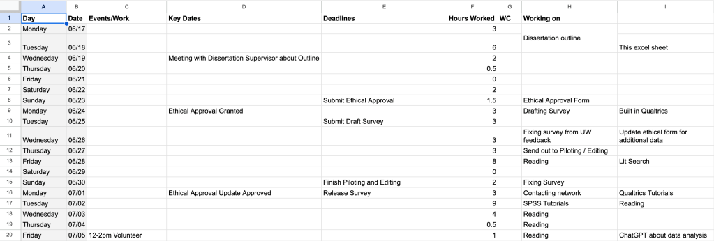 Organise your plan – like a project manager make a timeline and keep track of what you are doing, how long you are working and how much you need to do. There are many examples of these and templates online. Or you can use a simple Google Sheet or Excel sheet. It’s motivating to see how many hours you’ve put in.